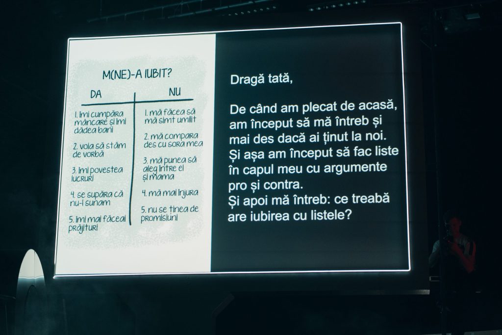 Textele, ilustrațiile și fotografiile care au stat la baza scenariilor pentru spectacol sunt în egală măsură, deci, niște mostre de curaj și de talent rafinat. Când au răspuns apelului nostru, mulți cu timiditate, nu și-au închipuit că poveștile lor vor trece de cercul urmăritorilor noștri. Pe scena teatrului Odeon, acestea prind o nouă și binemeritată viață.”