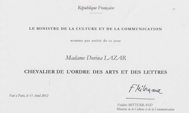 În documentul ce însoțește diploma emisă în data de 13 aprilie 2012, Ministrul francez al Culturii și Comunicării, Frédéric Mitterand, subliniază că Ordinul Artelor și Literelor este una dintre principalele distincții onorifice ale Republicii Franceze, între cele patru ordine ministeriale ale statului francez. Această decoraţie se adaugă unui lung şir de alte premii pe care doamna Dorina Lazăr le-a primit de-a lungul timpului pentru activitatea sa interpretativă şi de director al Teatrului Odeon din Bucureşti, pe care o desfăşoară din 2003. Joacă pe această scenă din 1969, iar în perioada 1996-2002 a fost director artistic. Ca manager, Dorina Lazăr a reuşit să impună Teatrul Odeon în peisajul teatral naţional şi internaţional printr-un repertoriu divers, dar şi prin calitatea programelor alternative, multe dintre ele realizate împreună cu instituţii culturale prestigioase din străinătate.