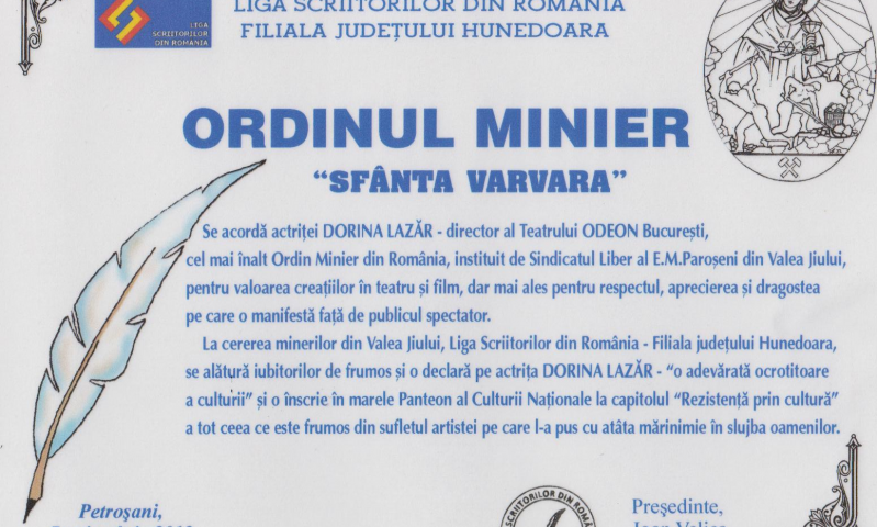 În seara zilei de 2 decembrie, după spectacolul Gaiţele, preşedintele Ligii Scriitorilor din România – Filiala Hunedoara, domnul Ioan Velica a acordat actriţei Dorina Lazăr, director al Teatrului Odeon Bucureşti şi actorului Marius Stănescu diploma şi medalia Ordinului Minier Sfânta Varvara (Cel mai înalt Ordin Minier din România).