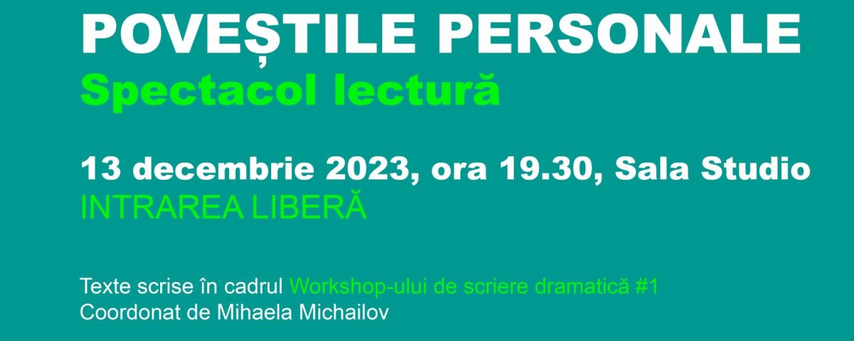 Miercuri, 13 decembrie, ora 19.30, vă invităm să vedeți cum poveștile personale ale actorilor Teatrului Odeon, Ioan Batinaș, Alina Berzunțeanu, Vlad Bîrzanu, Crina Mureșan, Virginia Rogin, Anda Saltelechi, sub condeiul a șase tineri dramaturgi, studenți și absolvenți ai Masterului de Scriere Dramatică de la UNATC I.L. Caragiale, coordonați de Mihaela Michailov, vor prinde viață pe scena Sălii Studio.