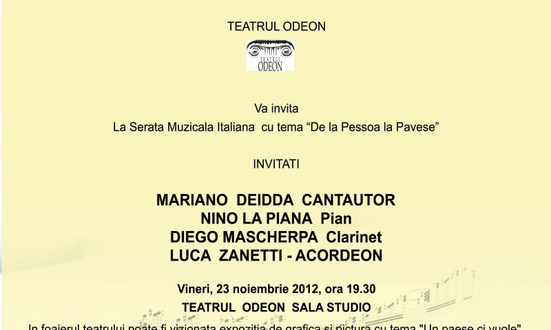 Sub Înaltul Patronaj al Ambasadei Italiei şi al Institutului Italian de Cultură, Asociaţia culturală “Amicii lui Pavese” în parteneriat cu Teatrul Odeon organizează o serată muzicală italiană în care versurile poeţilor Pessoa şi Pavese devin muzică.